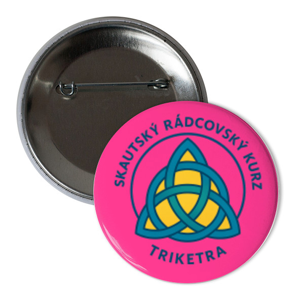 Kulatý odznak s růžovým podkladem, se znakem rádcovského kurzu triketra