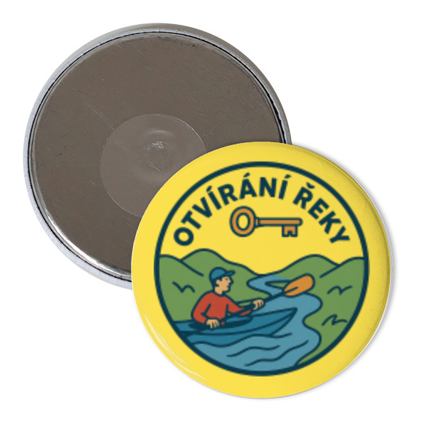 Kulatá magnetka se žlutým podkladem a logem otvírání řeky sázavy
