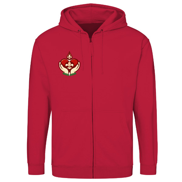 Červená mikina s kapucí se znakem skautských dárců krve