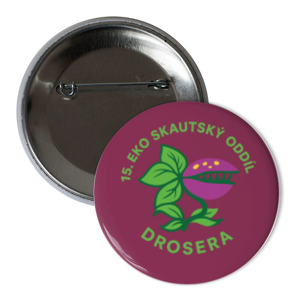 Kulatý odznak s vínovým podkladem se znakem 15. Eko skautského oddílu drosera